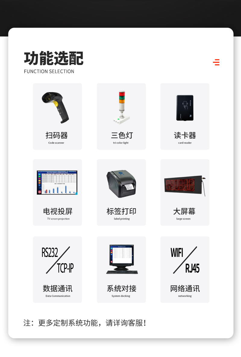 選配: 三色報警燈、各類打印機、讀卡器、掃碼槍、數據回收系統等